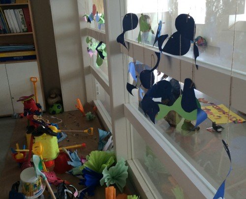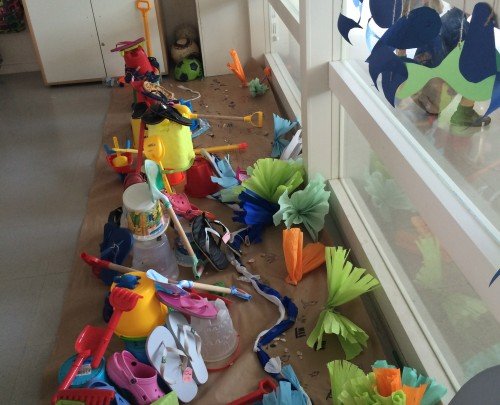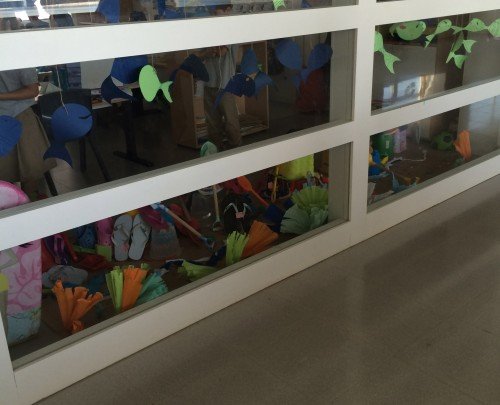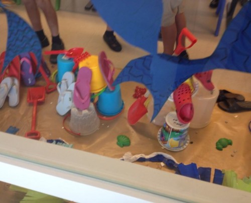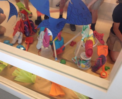 La temàtica consistia en el muntatge d’un aparador per una tenda de calçat estiuenc, dels quals ells n’eren els propietaris. Prèviament van portar des de casa seva tot tipus d'elements de platja per decorar l’espai tals com xancletes, galledes, rasclets,..Entre tots dibuixàrem, retallàrem, pegàrem i col·locàrem tot el decorat i el producte a exposar. Sobre el sòl la sorra i el mar, rodejat d’algues, peixos i múltiples dibuixos que ells mateixos van realitzar donant curs a l imaginació.